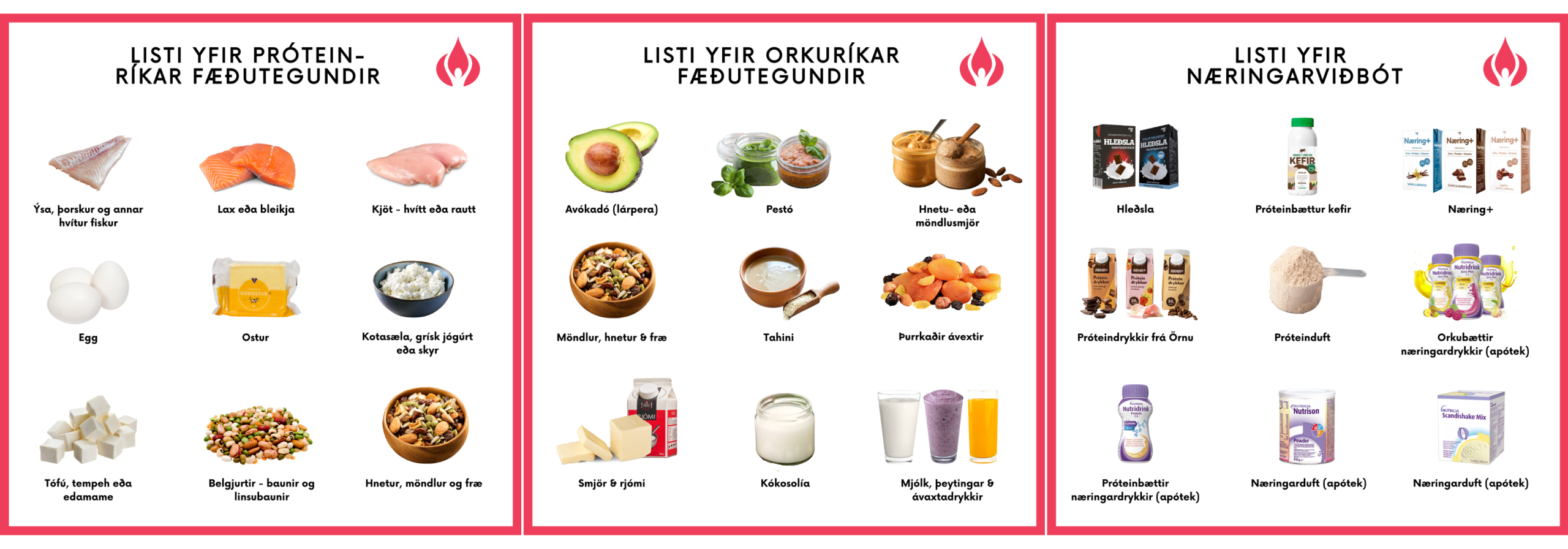 Hér að neðan sérðu lista yfir orku- og próteinríka fæðu ásamt næringarviðbót sem hægt er að nýta sér: