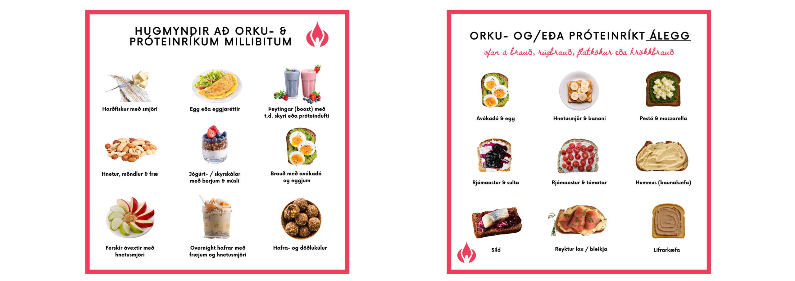Hér að neðan eru hugmyndir að orku- og próteinríkum máltíðum / millibitum & áleggi: